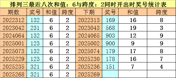 开奖回想:体彩陈列三第2025268期奖号为:321。和值为:6,跨度为:2。